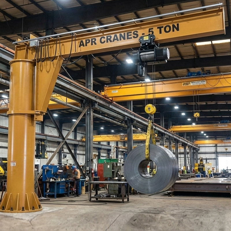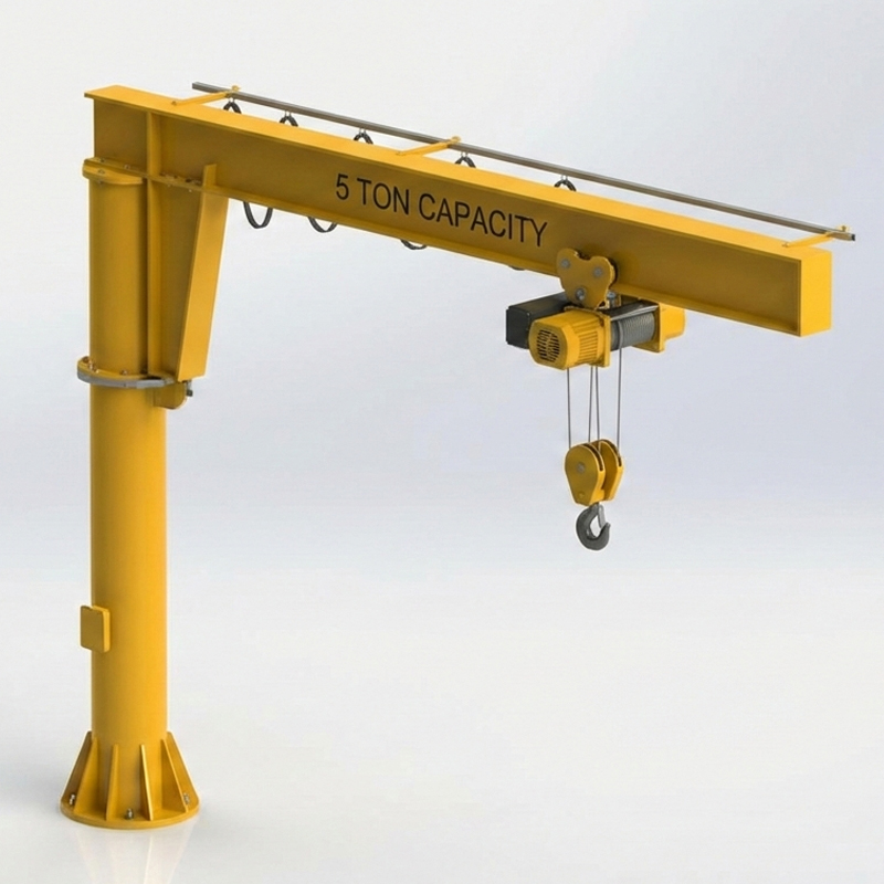 APR Cranes offers 5 ton jib crane model in heavy-duty pillar mounted configuration with the freestanding design and 360° Continuous features to rotate in the industries and lift the maximum material and increase the productivity with rotation functions.